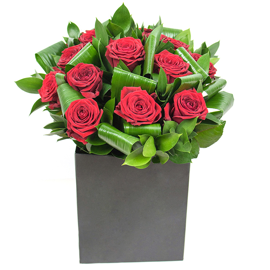 Enhance your home with our stunning bouquet, featuring vibrant red roses, lush aspidistra leaves, and delicate ruscus. This unique design exudes elegance and sophistication.